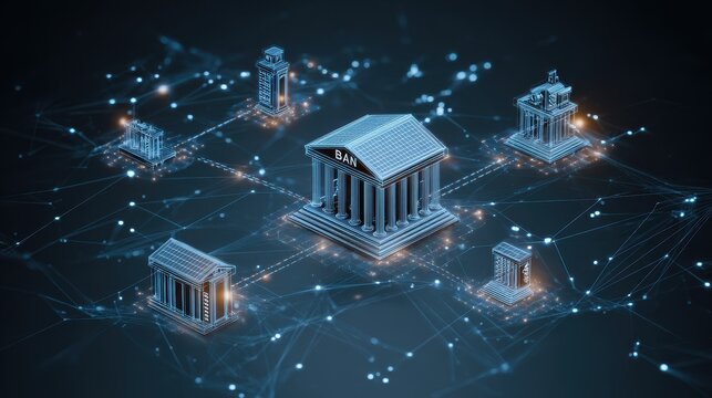 Network of interconnected banking institutions showcasing modern digital architecture and technology