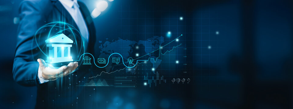 Businessman hand-holding banking and technology icons with a global network connection. Facilitating the growth of the banking sector, financial institutions, and technology-driven businesses