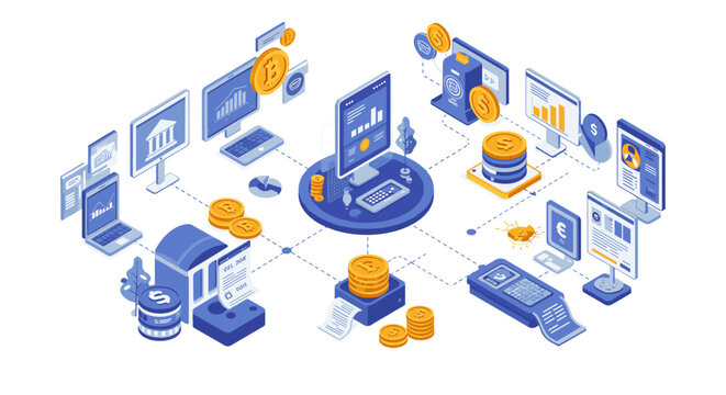 Isometric financial technology vector illustration: digital currency and banking solutions for modern financial management
