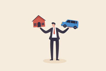 Businessman holding loan house and car. Financial and business risk, banking loan and debt risk, stability or balance of economics.