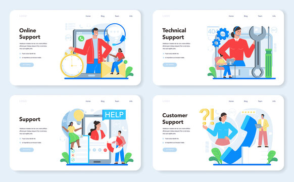 Customer support service posters. Call center online help flyers with specialist solve client problems via internet. Operator staff in headset work on hotline helpdesk, Line art vector web banner