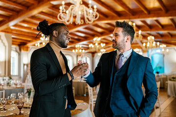 Wedding banquet hall in the greenhouse, tables are set, decorated with fresh flowers, candles, crystal chandeliers. Soft selective focus.