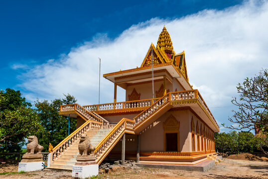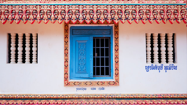 Exterior of a temple on the grounds of a Buddhist monastery in Kralanh, Banteay Meanchey, Cambodia, Asia