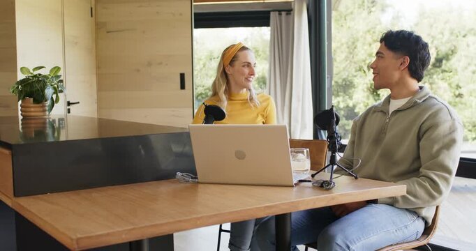 Female host greeting male co-host at wooden table, sparking playful banter around laptop microphone