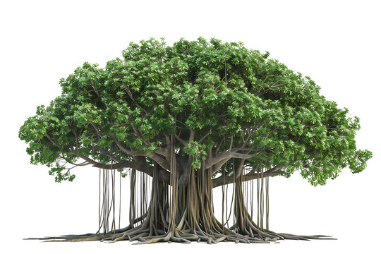 Majestic banyan tree with sprawling aerial roots and twisted trunk stands tall against a pristine transparent isolated background.