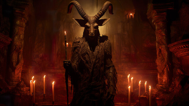 diabolical representation of evil, with goat head with large horns and human body. old sepia-toned photograph of baphomet performing a satanic ritual