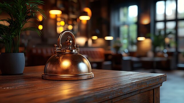 Stylish metal bell for calling a bartender or waiter on the bar counter. Bell restaurant on the bar with bokeh