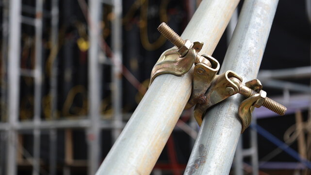 Close-up view of metal pipe joint connection on industrial scaffold structure at construction site. Focus on steel clamp system, supporting platform stability, safety, and engineering precision