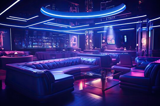 The interior of the night club with a black sofa, a bar counter and a blue neon light, Interior of a night club with bright lights. Night club. A decorated night club, AI Generated