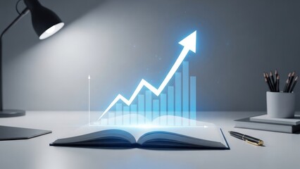 An open book on a wooden surface illuminated from above by a glowing light bulb Hexagonal icons representing concepts like light bulbs gears and bar graphs rise from the book