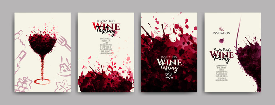 Collection of templates with wine designs, illustration of wine glasses with spots and food symbols. Brochures, posters, invitations, promotional banners, menus. Vector illustration