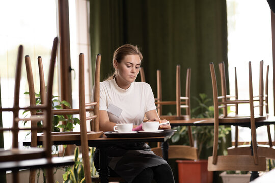 Waiter resting in a cafe at the table, tired restaurant worker, hospitality service