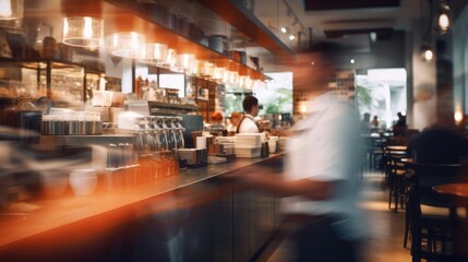 Blur coffee shop or cafe restaurant, Blurred restaurant background with some people and chefs and waiters working, Generative A
