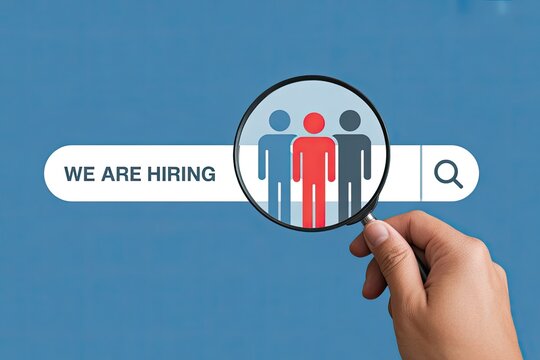 Conceptual image of hand holding magnifying glass over search bar finding right candidate for hiring