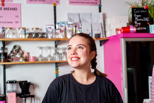 Cartoon people spend time talk at cafe on bar vector flat illustration. Colorful man and woman eat drink and communicate at cafeteria isolated on white. Female waitress personnel stand at counter