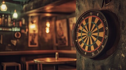 A dartboard hanging on a rustic bar wall, surrounded by dim lighting and casual seating, evoking a fun and relaxed atmosphere.
