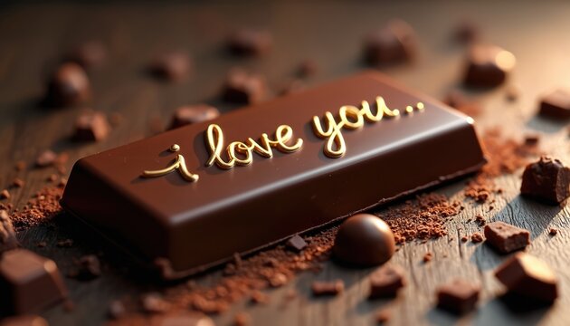 Dark chocolate bar with elegant golden i love text. Romantic sweet dessert on rustic wooden table with cacao powder. Gourmet candy makes perfect gift for lovers on Valentines day special anniversary