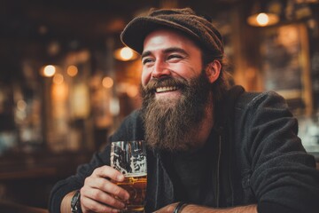 Cheerful bartender promoting happy hour at pub with craft beer specials