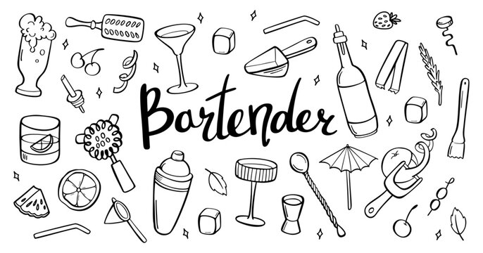 Bartender equipment for making cocktail outline set. Bar tools Hand illustration. Bar accessories. Stirring spoon, muddler, pitcher, jigger, shaker, glass, beer, peel. Sketch style, crooked doodle.