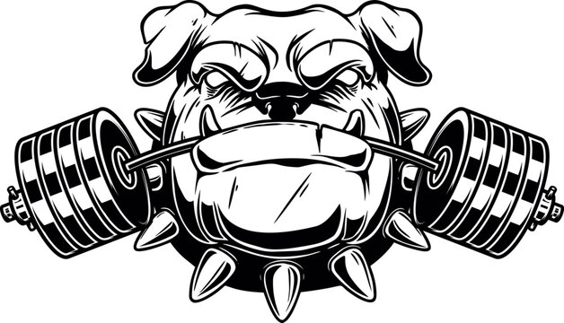 Angry dog head with gym barbell in teeth. Design element for logo, sign, emblem. Vector illustration