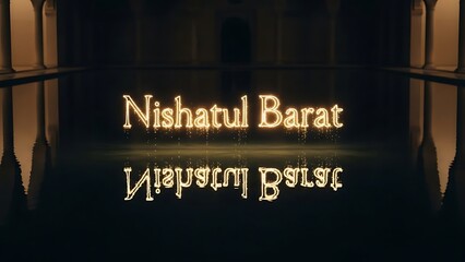Glowing Nishatul Barat text reflection on water. Dark islamic architecture night scene.