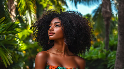 Barbadian woman with curly hair enjoys the lush outdoor environment