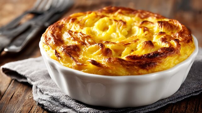 Barbadian macaroni pie isolated on a white dish, baked creamy macaroni with golden crust