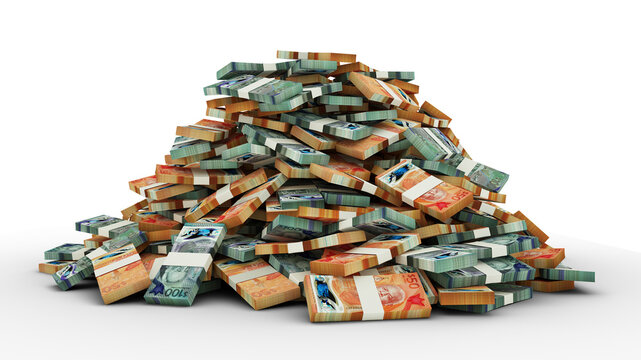 Big pile of Barbados Dollar notes a lot of money over transparent background. 3d rendering of bundles of cash