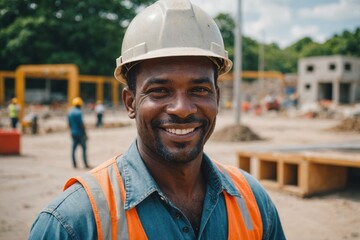 Close portrait of a smiling 40s Barbadian man construction worker looking at the camera, Barbadian outdoors construction site blurred background