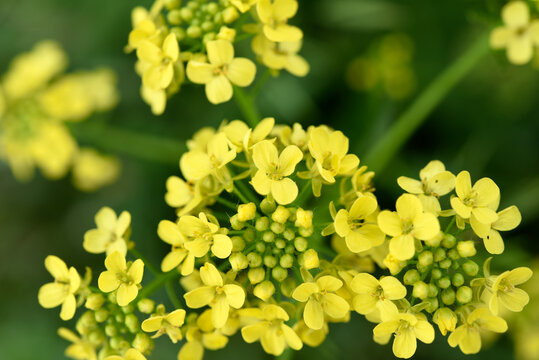Yellow barbarea flowers in the meadow, closeup