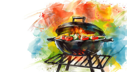 Watercolor clipart of a Fourth of July barbecue party, single object, isolated on white