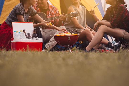 Cropped image of man and woman sitting in chairs outside the tent.Dinner party, Camping barbecue and roast pork ,vintage style ,Relaxation Fun Concept.