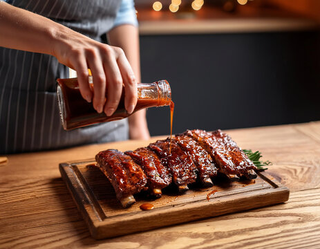 Chef pouring a delicious sauce on barbecue ribs on wooden cutting board in restaurant kitchen