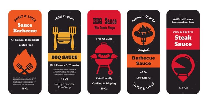 BBQ sauce label design, Taco sauce label design, Mexican food label, barbecue spicy sauce packaging label vector illustration. Black premium quality spice food label designs.