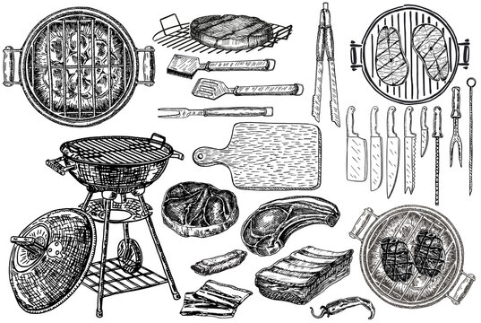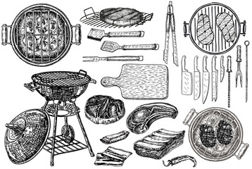 Set of barbecue elements drawn in vector. For the design of the menu of cafes and restaurants, shop windows related to the theme of grilled food.