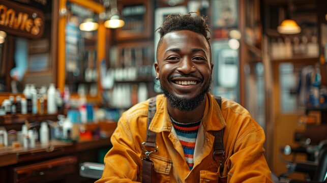 Smiling barber in a vibrant barbershop with warm wooden interiors, rustic decor, and a casual yet professional atmosphere, highlighting grooming and craftsmanship..