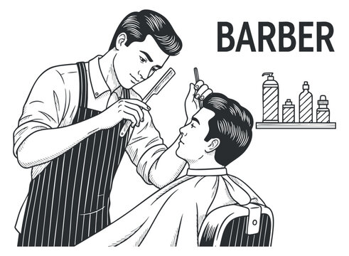 A barber styling a man's hair with scissors and comb in black and white line art illustration, suitable for barbershop branding