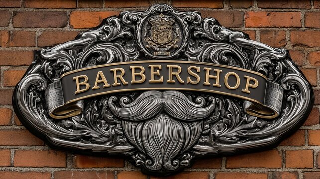 Ornate barbershop sign with intricate detailing and classic design mounted on a brick wall