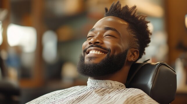 Happy African American man getting a haircut and having his beard trimmed at a barbershop