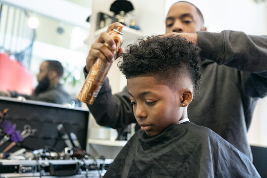 Young African man visiting hairstylist in barber shop. Professional hairdresser cut hair with scissors.