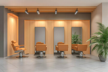 Modern hair salon interior design, stylish chairs and mirrors, wooden walls, plants. Ideal for website or brochure