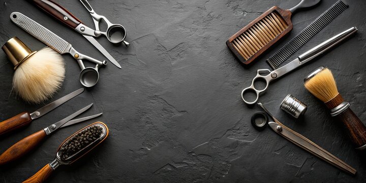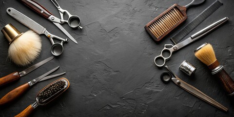 Top view of professional barber tools on black background, barber, tools, scissors, comb, hair clippers