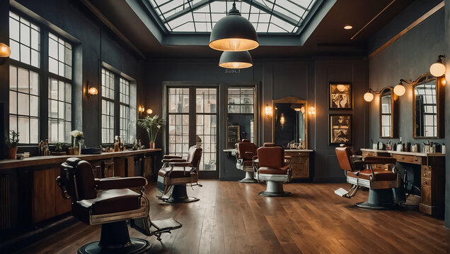 empty chairs and mirrors in modern barbershop interior
