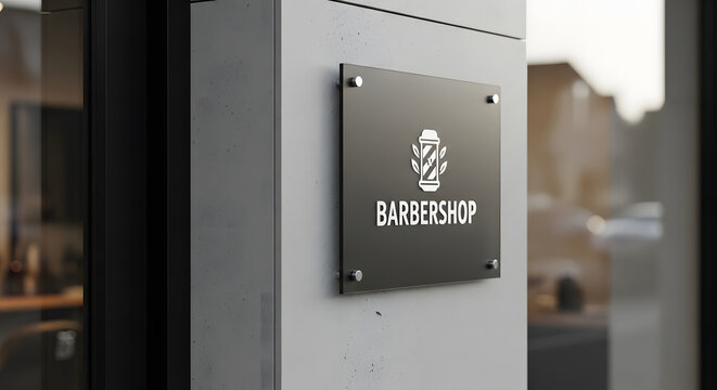 A modern barbershop sign adorns a building exterior, featuring a sleek black plaque and a stylish logo for hair styling services.