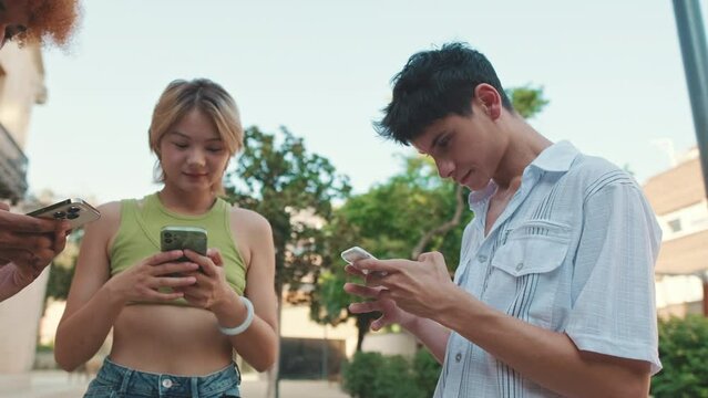 Front view of young trendy hispanic american man using mobile phone while walking outdoor in city street. Slow motion high quality 4k footage