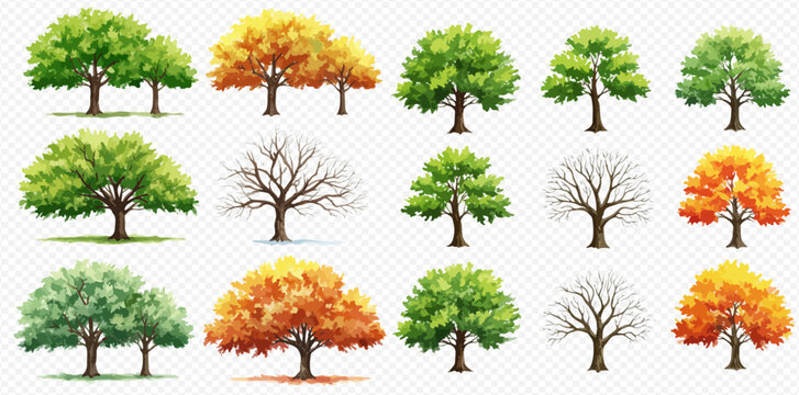 A collection of illustrated trees showcasing the four seasons, with green, yellow, and orange foliage, and bare winter branches.