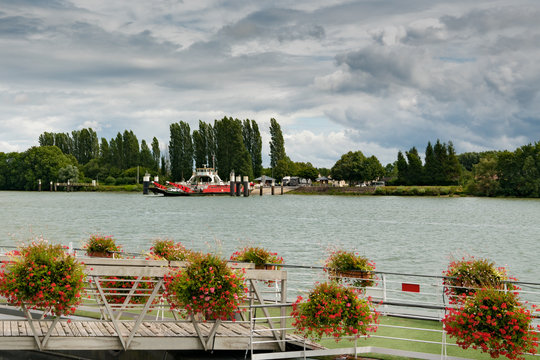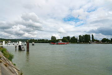 car and truck ferry crossing the Seine River in Duclair in Upper Normandy
