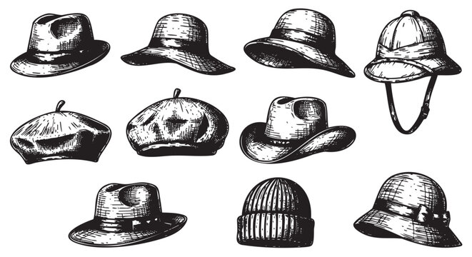 Black and white sketch of various vintage hats including fedoras, berets, helmets, and a knitted cap, showcasing a variety of classic headwear styles.