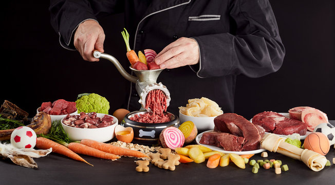 Process of preparing bowls with natural raw pet dog food at home, preparation of healthy raw barf for cats dogs, with duck, turkey, offals, meat, vegetables, assorted fresh food portions in containers