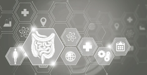 Graphic illustration of Intestine organ marked by hexagon molecule. Healthcare concept background with medical icons.